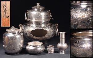 慶應◆皇室御下賜品 【若山清春】作 総純銀製四君子彫皆具 合計7kg!