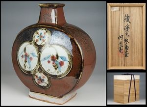 民藝巨匠【河井寛次郎】秀逸作 鉄薬丸紋扁壷 高島屋購入品 共箱 保証