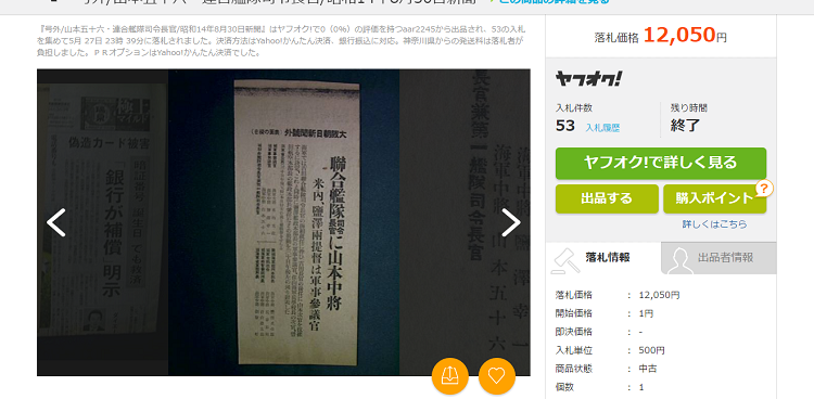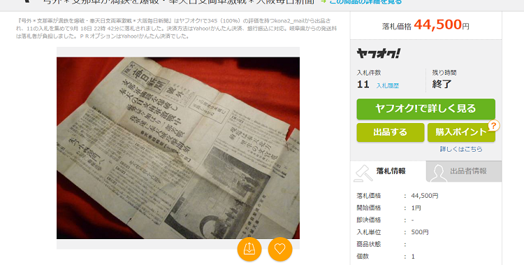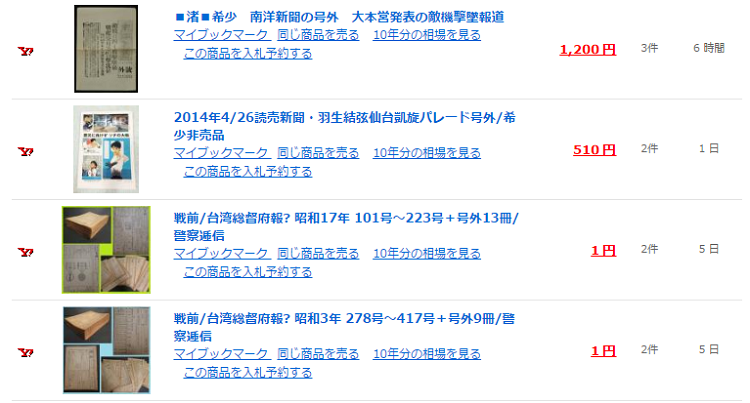 高額落札されているのは、歴史的な事件等がメインになりますが、直近のニュース関連の号外も多数出品され、競りが行われています。