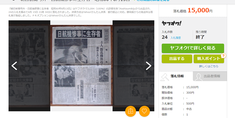 - 朝日新聞号外・日航機惨事に生存者 昭和60年8月13日 落札価格:15,000円