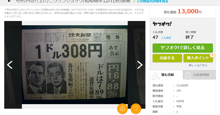 - 号外/円切り上げ/ニクソンショック/昭和46年12月19日新聞 落札価格:13,000円