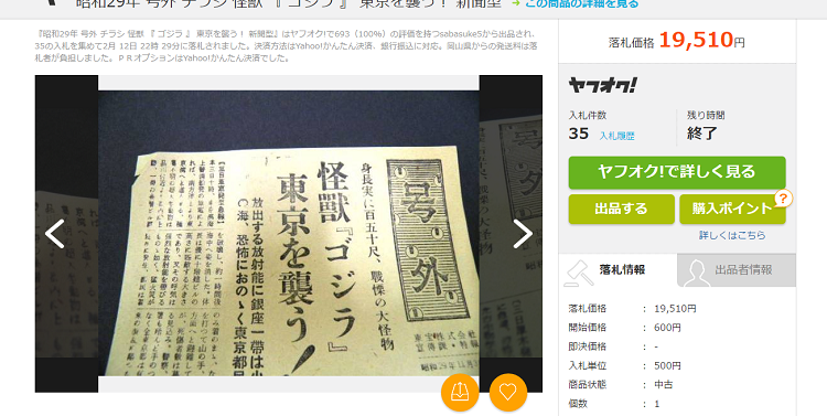 - 昭和29年 号外 チラシ 怪獣 『 ゴジラ 』 東京を襲う! 新聞型 落札価格:19,510円