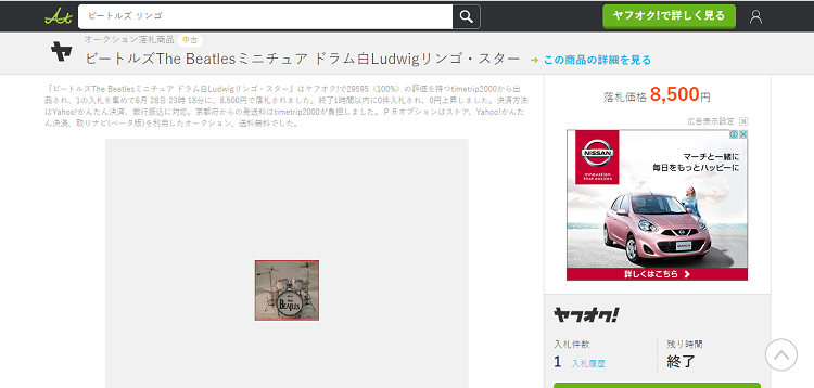 さっきのドラムのミニチュア版です。こっちはボディがホワイトですね。これが8500円で落札。やはりファンの人気が熱い証拠ですね!