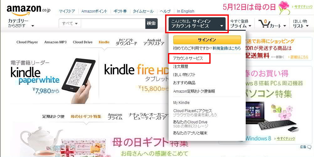 まず、アマゾンのTOP画面から、
