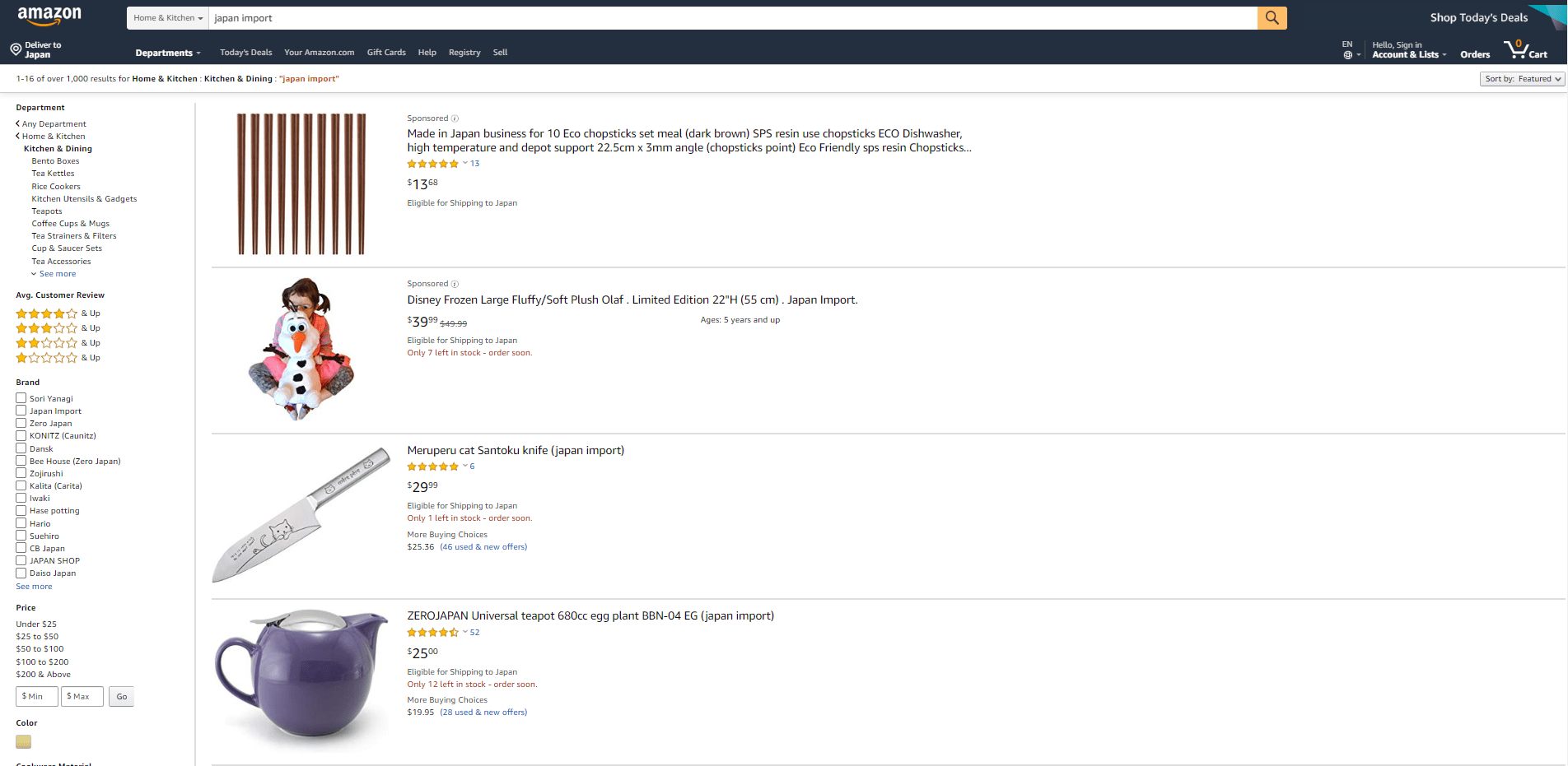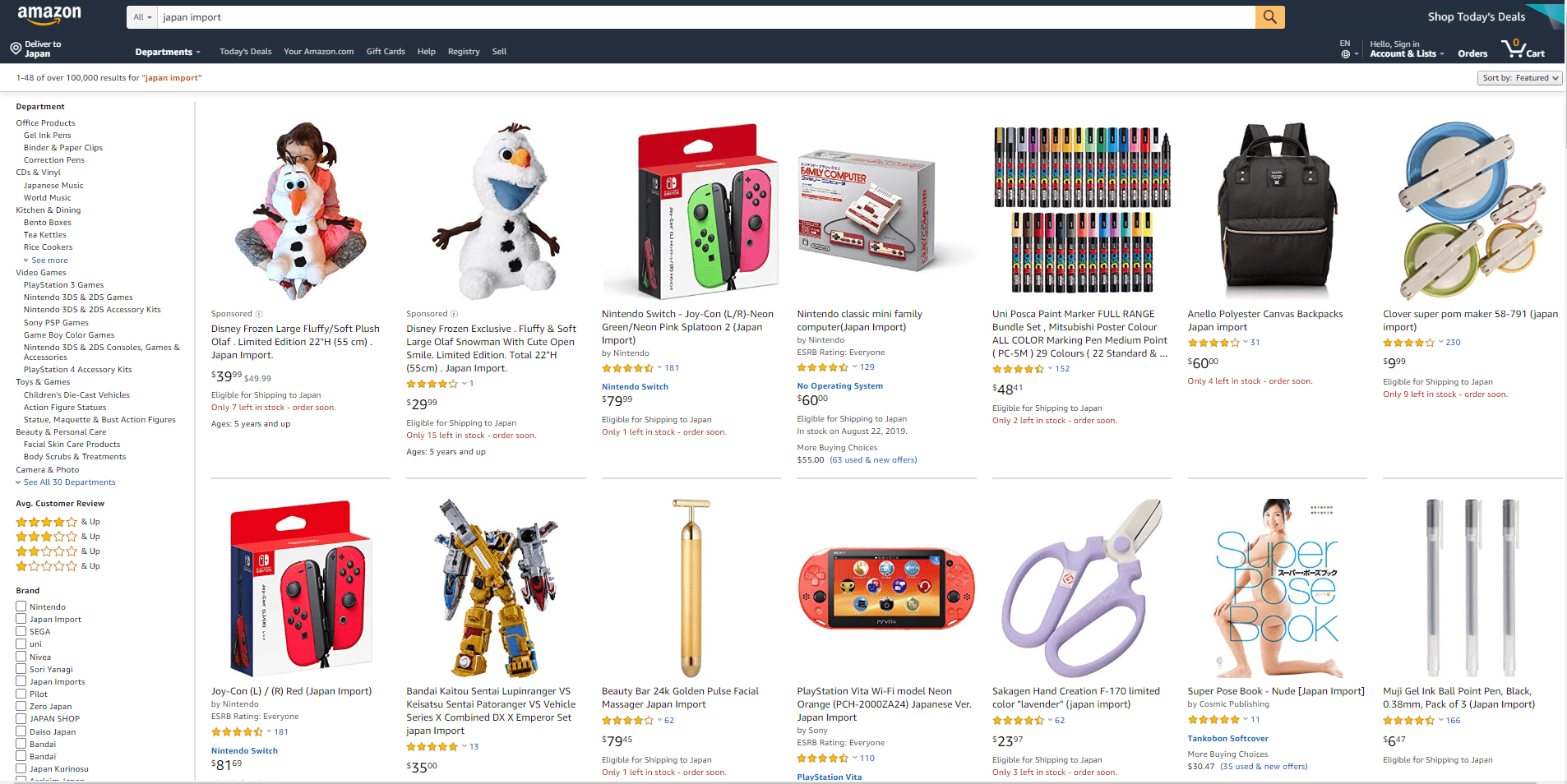 では、さっそく米国amazonで日本から輸出されている商品を見てみましょう。