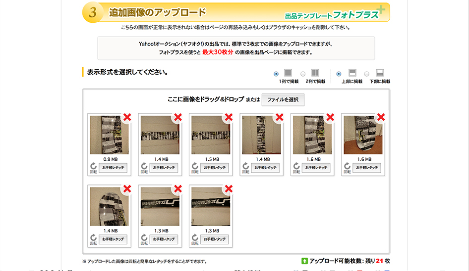 「フォトプラス」は、通常3枚までしか商品画像を掲載できないヤフオク!出品ページに、さらに30枚分の画像を掲載ができる機能です。