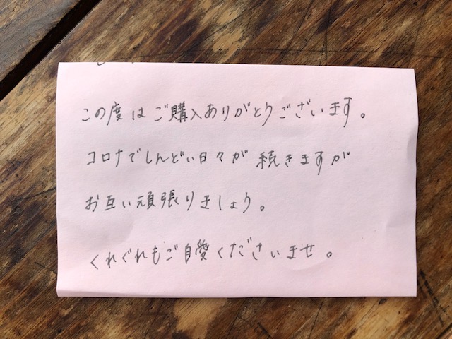 写真は娘が買った本に同封されていました。手書きのメッセージです。他にも参考書を買ったら、「受験頑張ってください」「コロナには気をつけて、乗り切ってください」などのメッセージがありました。