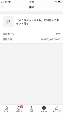 間違いなく配達していただき受取評価を得て、売上金も入ってきました。そしてゆうパケットポストを使ったことでメルカリポイントも20ポイントいただきました。