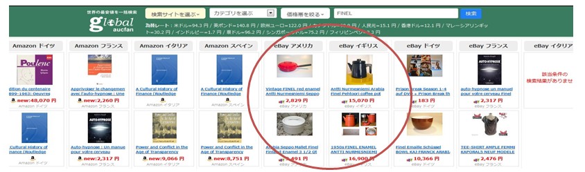 この「フィネル」のポットが、海外で取り扱いがあるか、グローバルオークファンで「FINEL」を検索してみることにします。