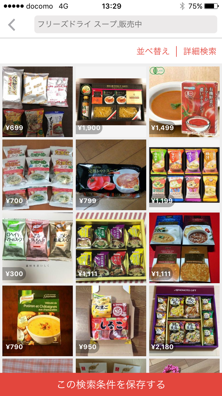 フリーズドライ スープで検索してみました。 表示されたサムネイルのほとんどにSOLDの文字...。 これを表示させたままでは、購入したい商品に辿りつきにくい! こういうときは右上の