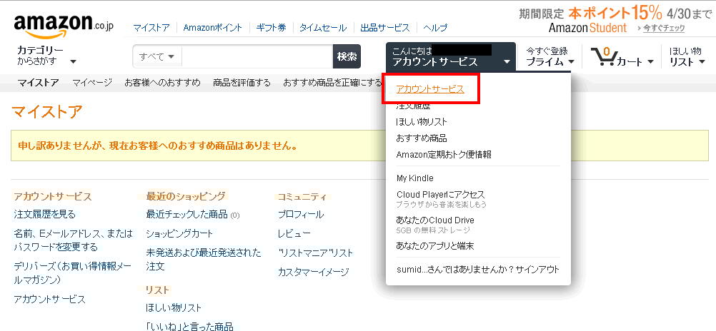 アカウントサービスをクリック