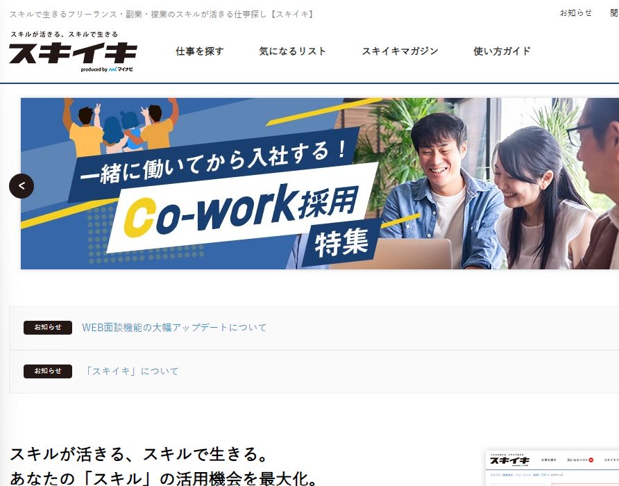 「スキイキ」は、IT系副業希望者と企業を繋ぐプラットフォームです。契約期間3ヶ月以上の案件が掲載されているので、安定した副業収入を得ることができるでしょう。