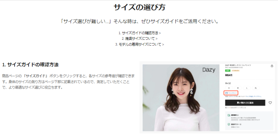 たとえば、モデルの着用サイズを確認できたり、注文時に自分の身長・体重・年齢・体型・好みのフィット感を入力するとおすすめサイズを提示してくれるサービスもあります。