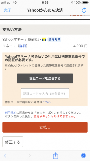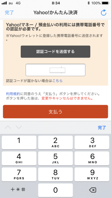 送られてきた認証コードを入力して、「支払う」をタッチします。