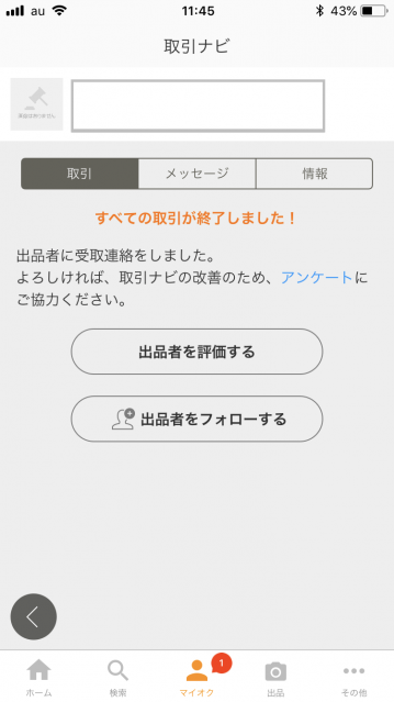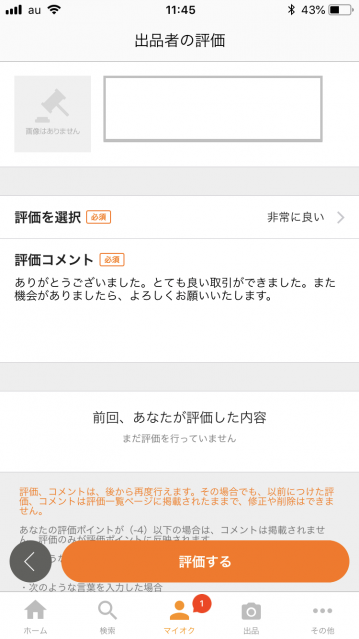 これで取引が終了しました。次に出品者の評価をします。