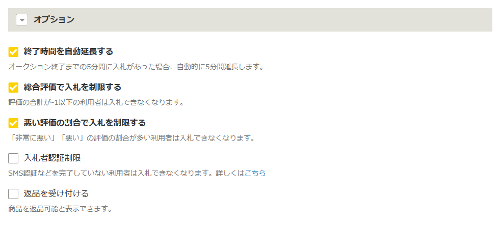 オークション終了間際に入札があった場合、自動的に終了時間を延長する機能です。終了間際にもっとも入札が多くなるのがオークションの特徴なので、落札金額を高くしたいなら自動延長を『あり』にしておきましょう。