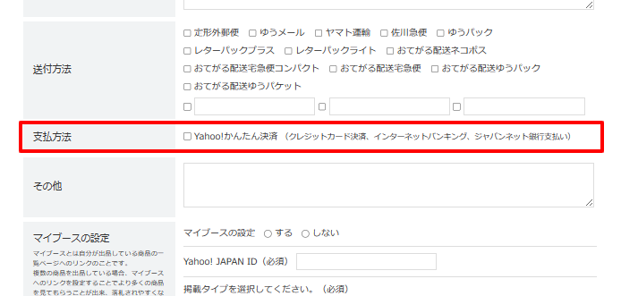 PayPay銀行を受取口座に登録したら、あとは出品ページ作成の際に決済方法欄でYahoo!かんたん決済のところにチェックを入れて出品するだけです。