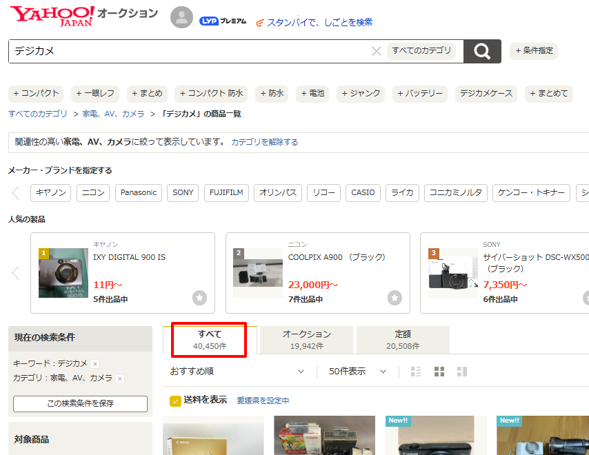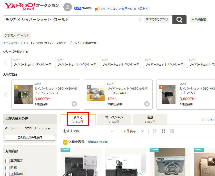 「サイバーショット」か「ゴールド」を含めばいいので、当然ながら、ヒットする商品の数は多くなります。なので、よほどレアなモノを探す以外には、この検索方法はほとんど使いません。