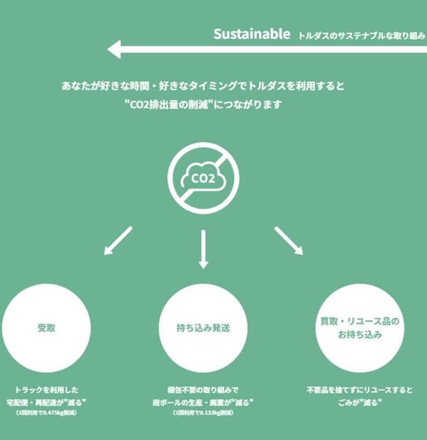 トルダスを利用するメリットは、受け取りと発送にかかる手間を省き、場合によっては梱包材が不要になり、送料も安くなることです。
