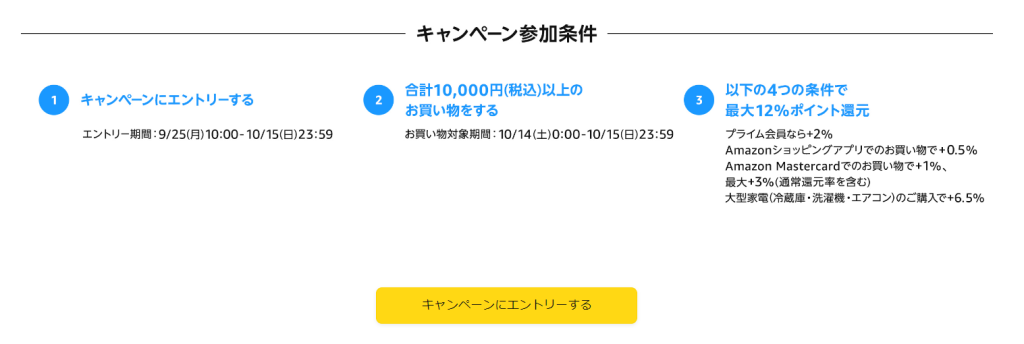 | 内容 | 最大12%ポイントアップ還元 ・プライム会員なら+2% ・Amazonアプリで+0.5% ・Amazon Mastercardで最大+3% ・大型家電の購入で+6.5% |