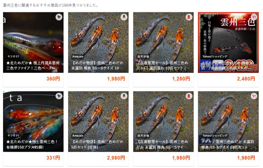 たとえば、錦鯉のような色合いで人気のメダカ「雲州三色」を購入したい場合。オークファンで検索すると、このようにYahoo!オークションやAmazonなどに出品されているメダカが一覧で表示されます(Amazonの商品は除外キーワードでは除外されないので注意)。