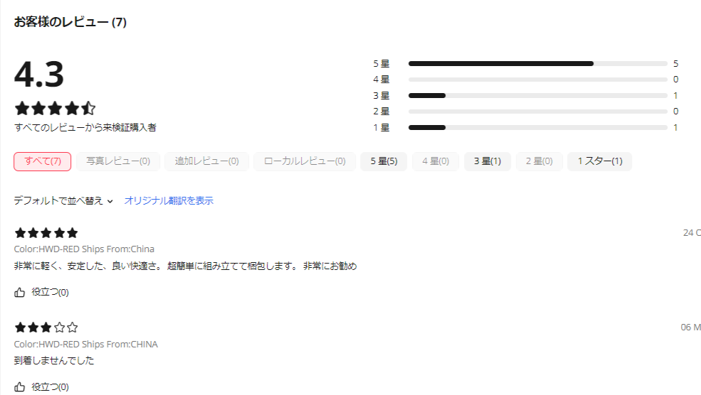 そして、購入する商品の評価、レビューは必ずチェックしましょう。