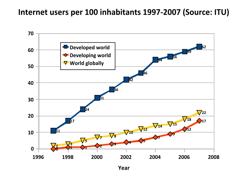上記の図の通り、1996年でもまだ世界のインターネット普及が10%程度でした。