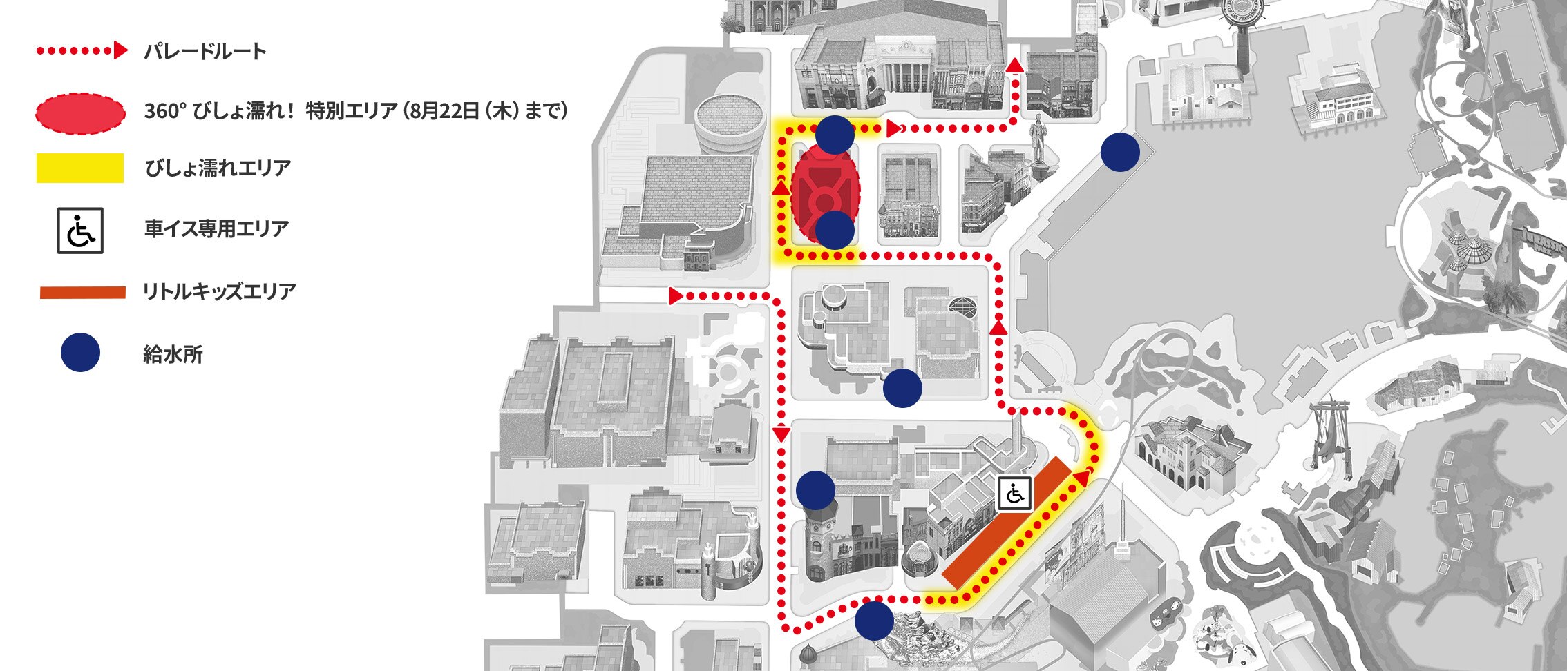 - 参加型パレードでキャストや大好きなキャラと一緒に水浴びができる