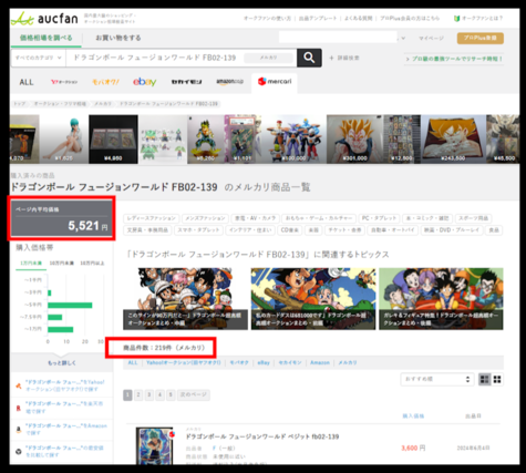 【2】相場検索機能を用いて各サイトの商品の相場と出品数を比較します。