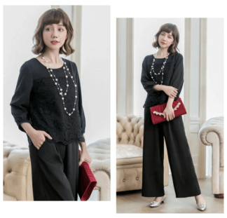 | 特徴 | ・ふくらみのあるゆったりとした 袖で二の腕をカバー ・背中のレースのスリットが 揺れて華やかな印象 ・ワイドパンツで脚長効果あり |
