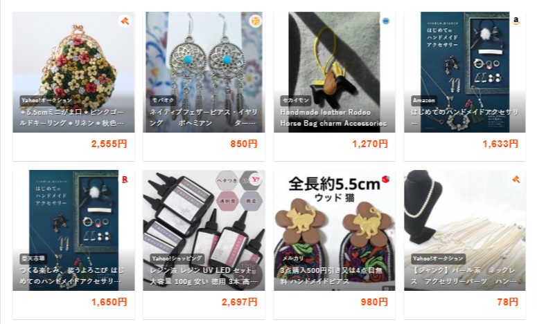 次は、ピアス、ネックレス、ブレスレット、リングなどのハンドメイドアクセサリーです。