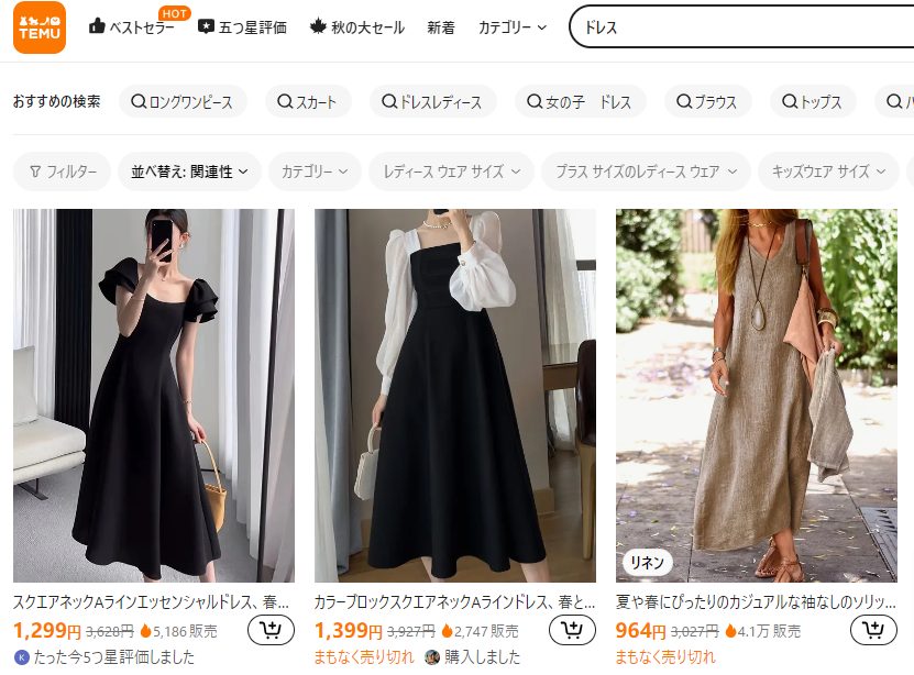 Temuではドレスを含めて、多くの商品がセール価格で販売されています。