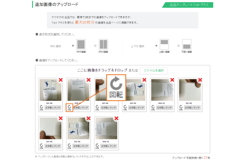 「出品テンプレートフォトプラス」は、通常3枚までしか商品画像を掲載できないヤフオク!出品ページに、さらに30枚分の画像を掲載できる機能です。