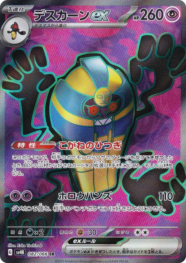 「デスカーンex」は、2023年10月27日(金)に発売された強化拡張パック「スカーレット&バイオレット 拡張パック「古代の咆哮」」に収録された「超タイプ」のポケモンカードです。