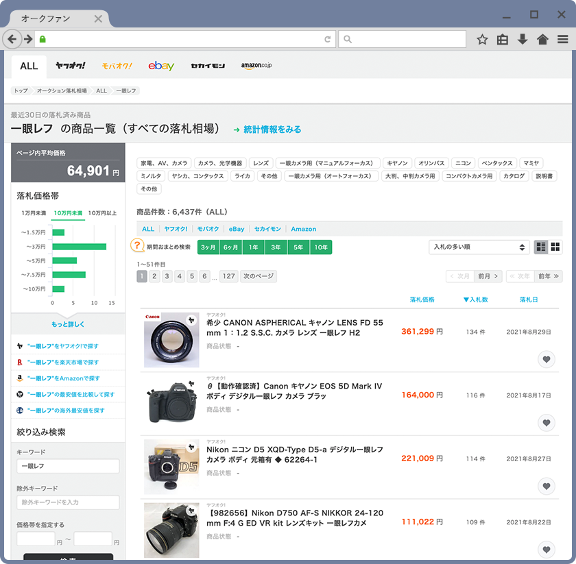 世界最大級のショッピングサイトAmazonを始め、話題のYahoo!オークション(旧ヤフオク!)やYahoo!ショッピング・楽天といった人気のショッピングサイトまでオークファンなら検索することができます。